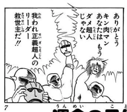 「ありがとうキン肉マン、あなたはもうダメ超人じゃない。我われ正義超人のリーダー、救世主だ!!」