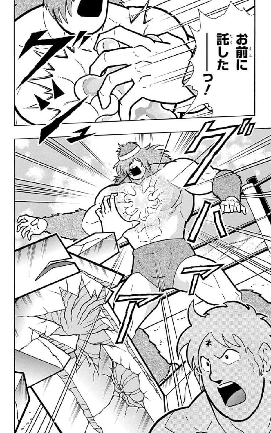爪 確かにWWEですね。闘いを描くカメラワークも、WWE的かも。ひとコマごとに客がワッと湧く声がきこえる気がする。もともと先生、見せ方がうまいもんなあ......あ、でも、WWEが今のフォーマットになるよりも先に、『キン肉マン』はこの見せ方を確立してる。