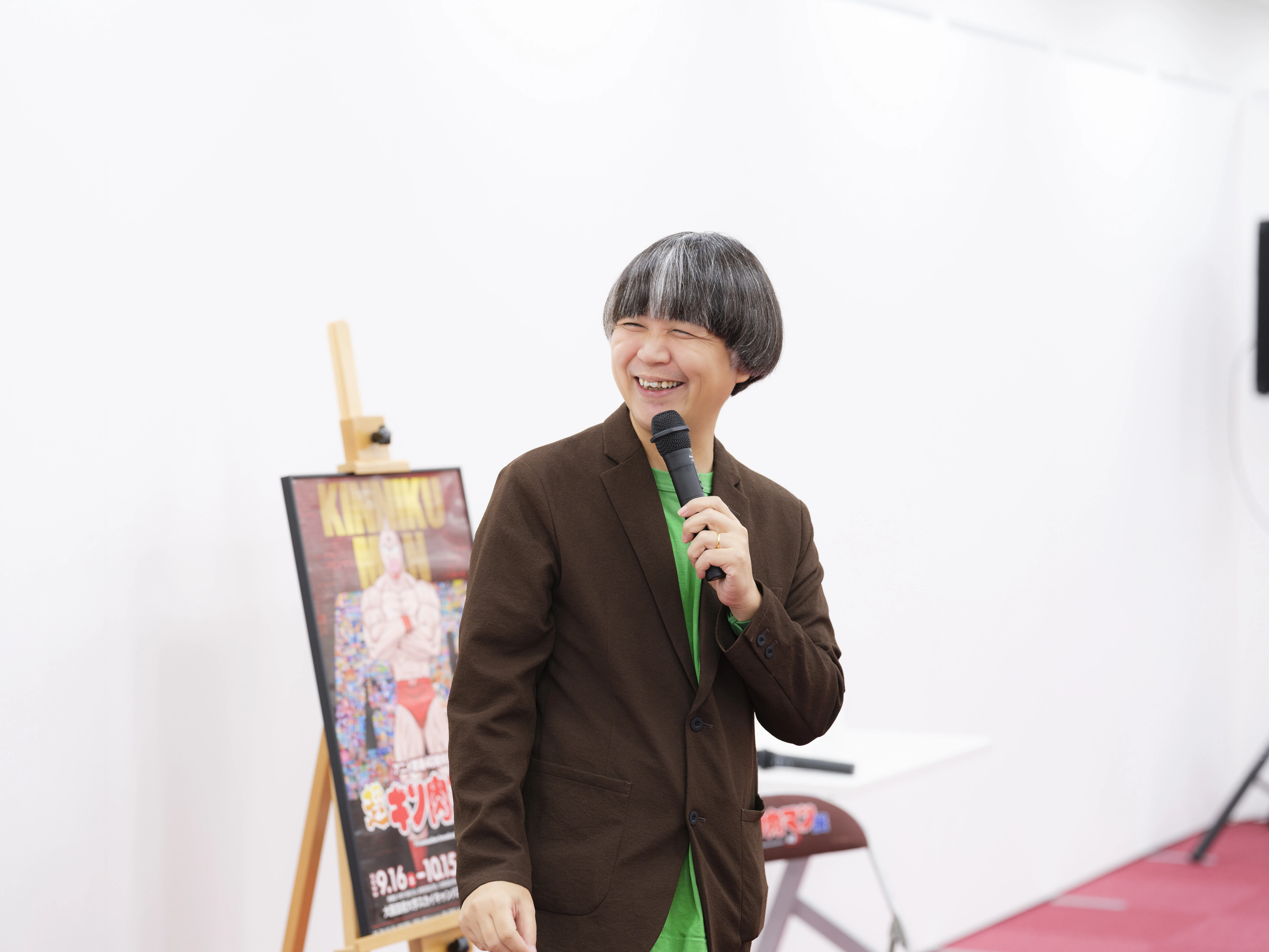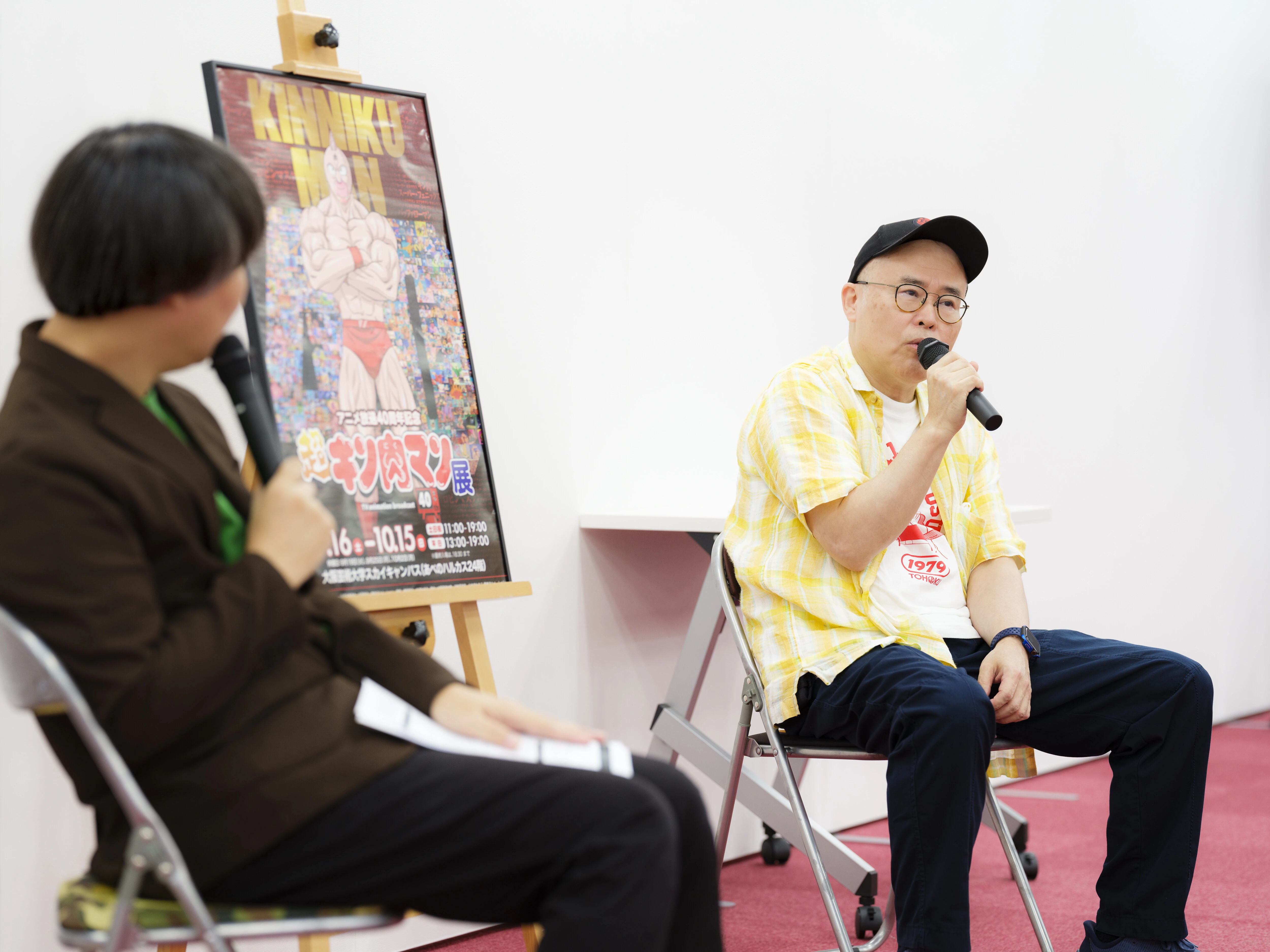 ステージには聞き手として、作品の大ファンであり、かつ大阪芸術大学芸術学部デザイン学科卒でこの日に集まった学生たちの先輩にもあたるイラストレーター・中村佑介氏も登壇。ロックバンド「ASIAN KUNG-FU GENERATION」のCDジャケットなど、数多くの作品を生み出しているプロのクリエイターとしての目線を備えつつ、『キン肉マン』に対しても並々ならぬ愛情を示す中村氏から、中井先生に様々な質問をぶつけていく形でこの日の会は進行していった。