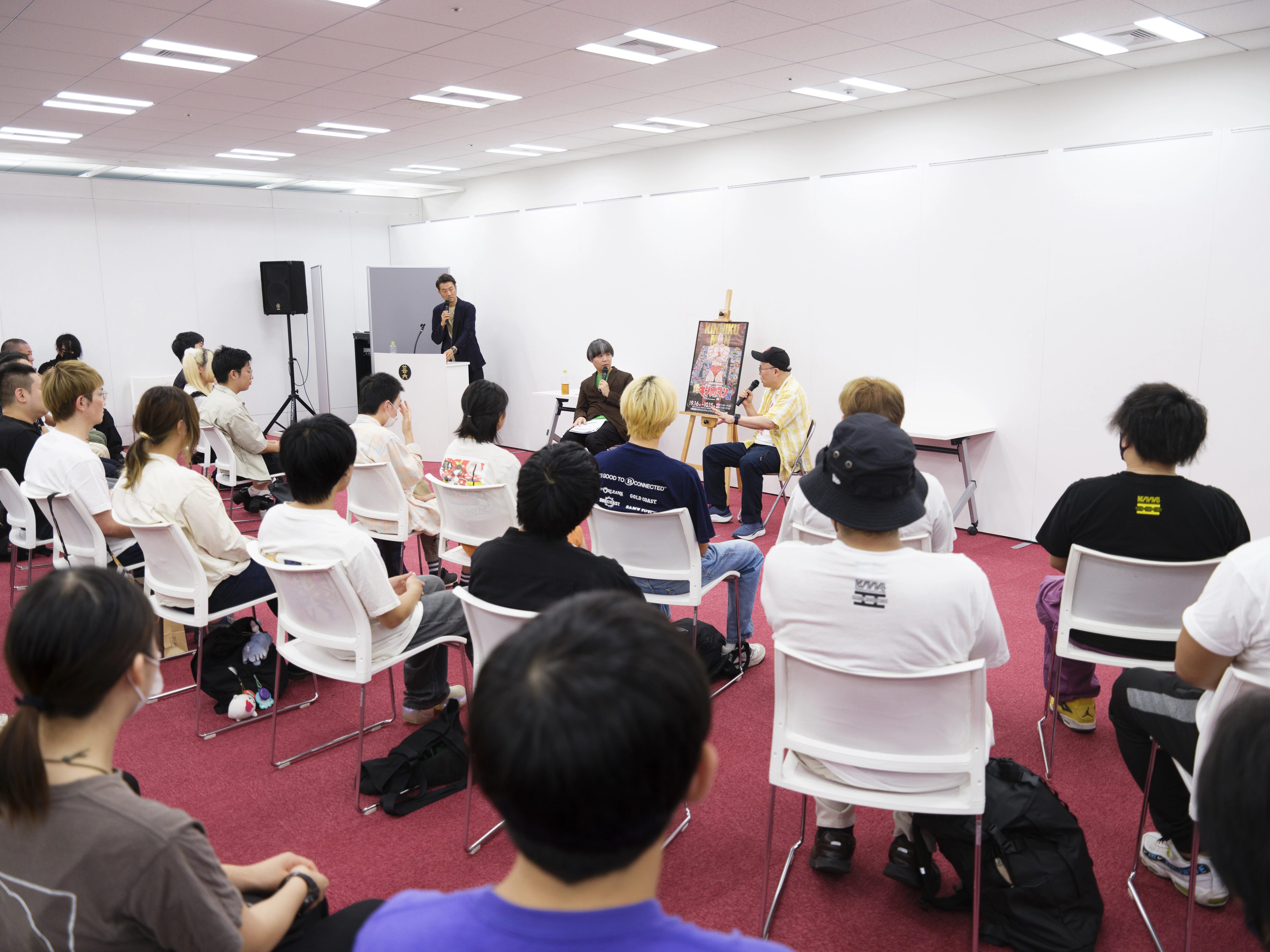 大阪あべのハルカス24階の大阪芸術大学スカイキャンパスにて対談イベントを行なったゆでたまご中井先生(右)とイラストレーターの中村佑介さん、そしてキン肉マン