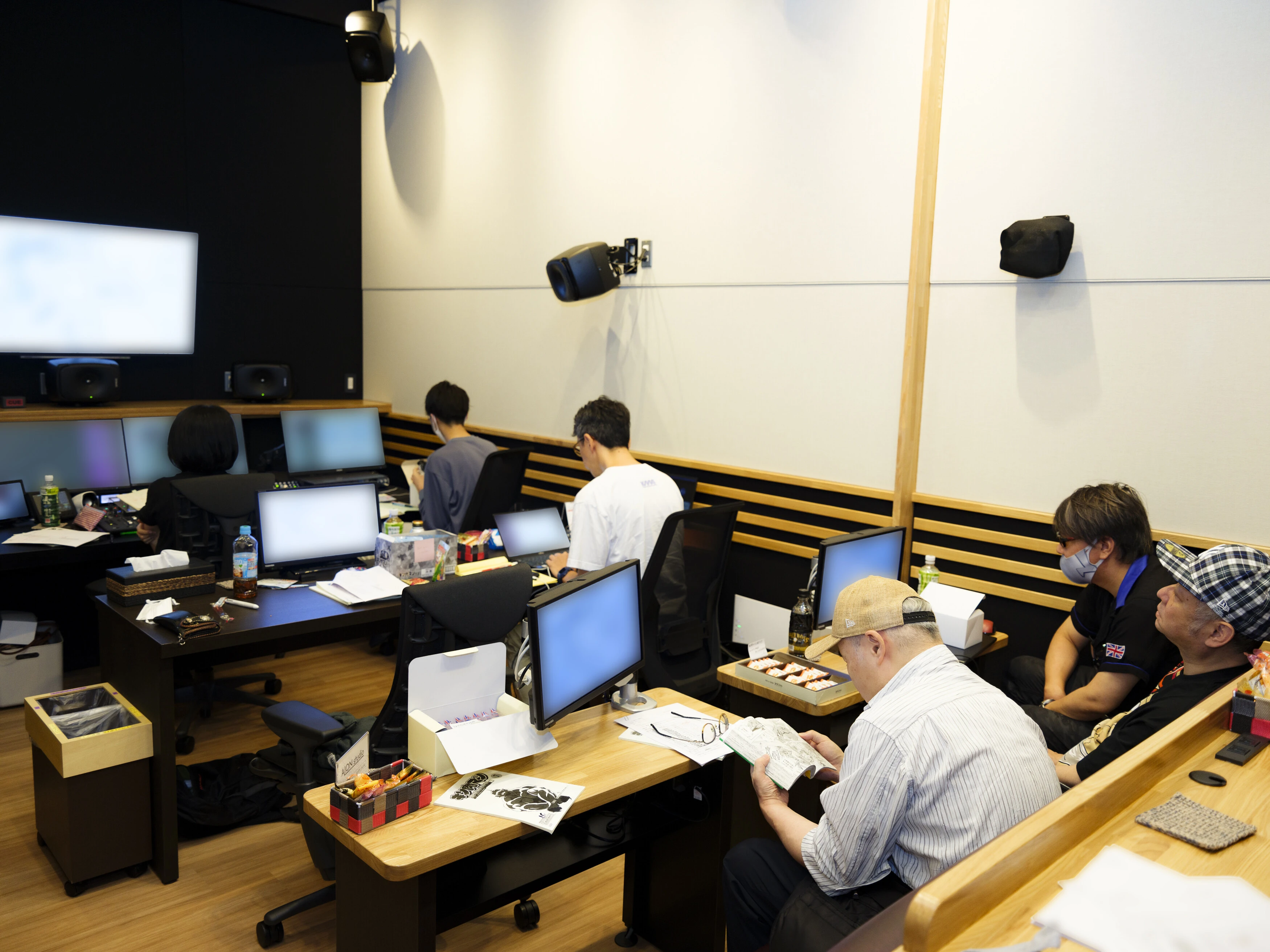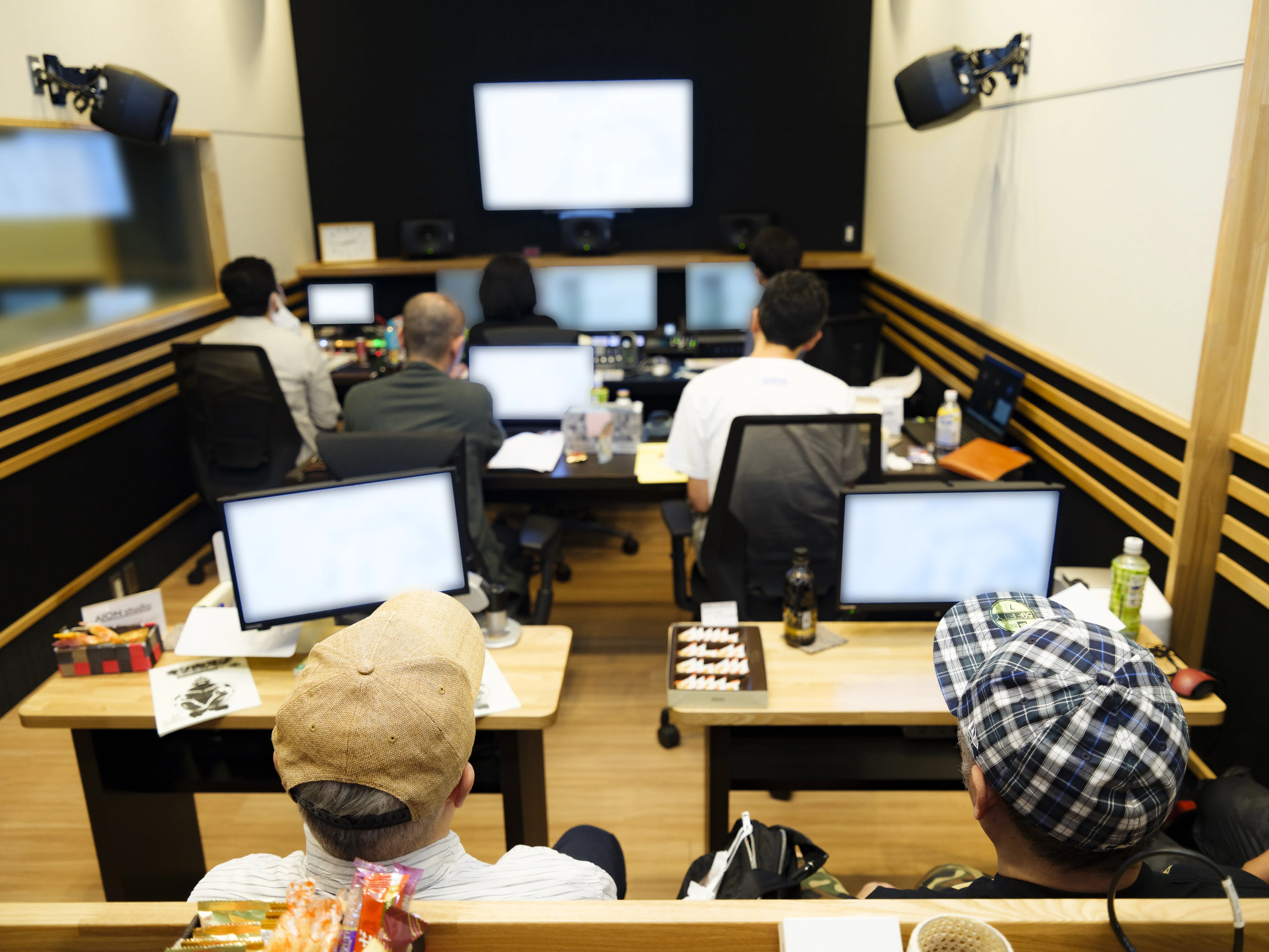 収録は週一回で1話分、コロナ対策として声優の入り時間をなるべくずらしているため、朝から夕方くらいまでとかなりの時間をかけて録っている。スタッフ陣がいるコントロールルームと声優陣がいるブースがあり、そこで映像を流しながらキャラクターに命を吹き込んでいく。