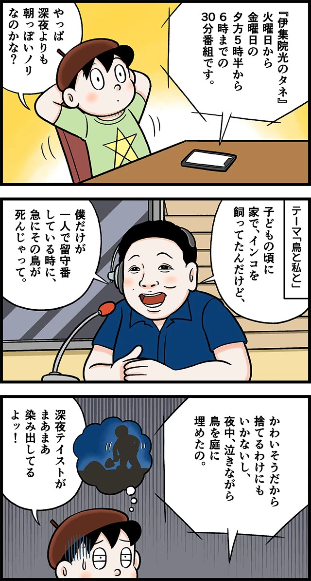 結果、火~金曜日の17時30分から30分の録音(時々、生放送)という変則的な帯番組『伊集院光のタネ』がスタートした。じっくり聴かせる長尺のフリートークが持ち味の伊集院だけに、30分番組は短いかなと思っていたが、実際はじまってみると、おたよりコーナーに特化した番組のため、30分でも思った以上に聴き応えがある。