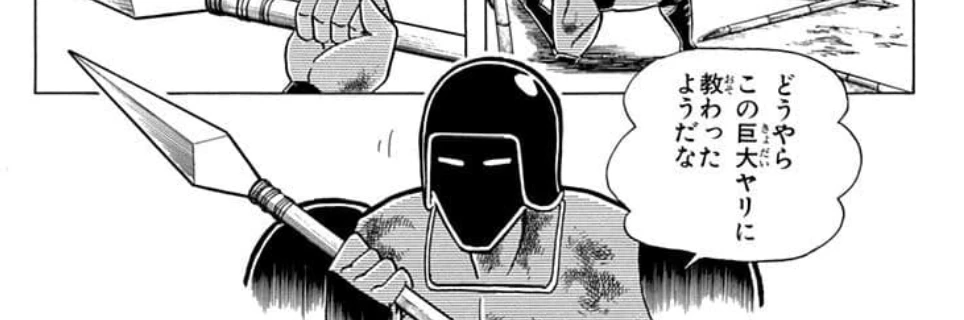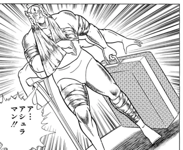 超人血盟軍の一員としてサタンクロスと激闘の末、引き分けたものの大きな負傷を負ったアシュラマンがまさかの再登場! とても感動的な超サプライズシーンなのですが、同時につい気になってしまったのが彼のついている一本の松葉杖......。腕が特殊なだけに果たしてこのつき方であっているのか、そもそも杖は一本だけで本当に大丈夫なのか、それに腕を何本も大ケガすると他の超人よりも治療費がかさみそうだな、などなどこの1コマの姿だけで次々と妄想が湧いてきて止まりません。レスラーパンツ一丁なのも激レア!