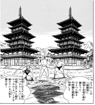 そうしてマッスル・スパーク会得の特訓は大詰め、ふたつの像がひとつに重なるという奈良の一面鏡池を使って真の像をあぶり出す段階へと移行していくのですが、ヒントにヒントを重ねてついにこの手段までたどり着いたというのがそれだけでミステリーの手順を踏んでいてとても面白いんですよね。