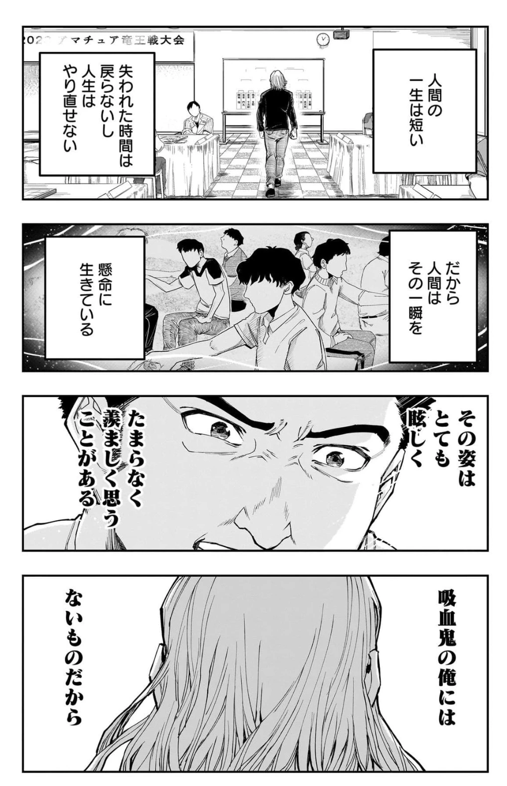 そういった相手に対して、時間だけがたっぷりあった凡人の吸血鬼が、努力だけで闘い続けるっていう作品は今までになかったですよね。超人的な身体能力を持っているけれども、あくまでも「将棋のルール」に完全に従ってて、たとえ追い込まれたからといっても超能力とかでズルしたりは絶対にしない。