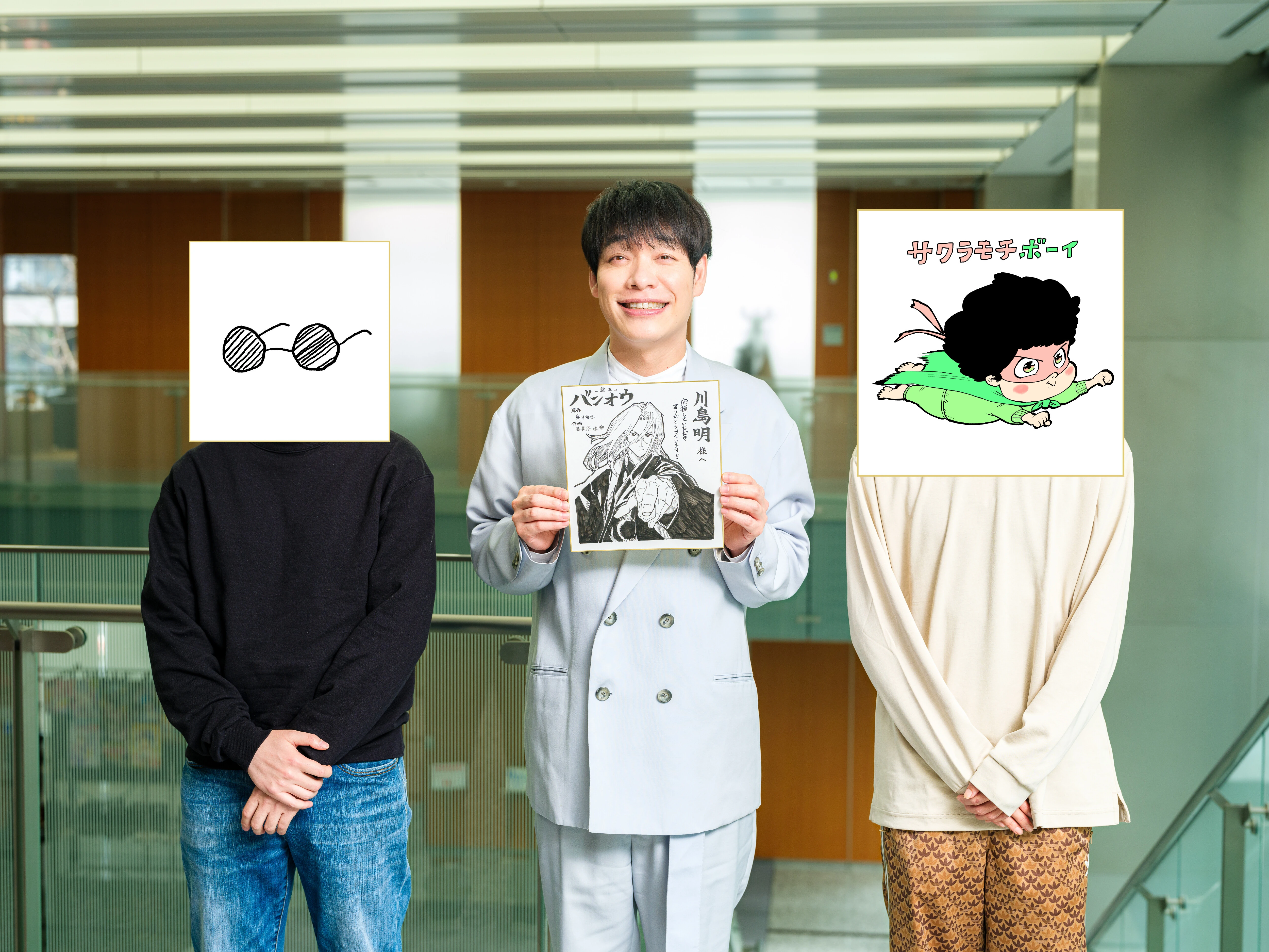 『ジャンプ+』で連載中の『バンオウ-盤王-』を絶賛する麒麟・川島明さん。今回は、原作担当の綿引(わたひき)智也先生、作画担当の春夏冬画楽(あきない・がらく)先先生との鼎談を行なった