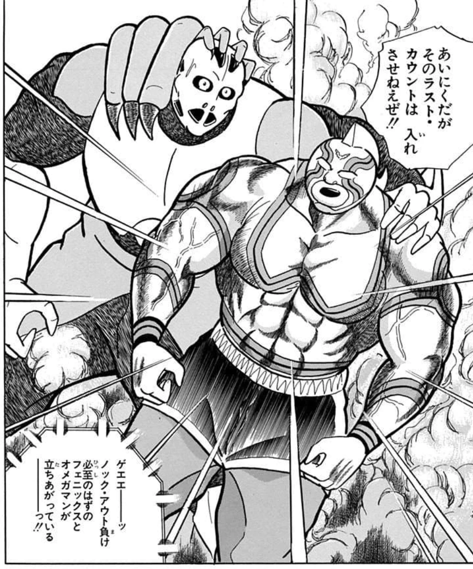 こうして52の関節技まで会得したキン肉マン。カメハメが退場したあとにのこったオメガマンは、もはやキン肉マンの敵ではありませんでした。カメハメとの死闘のうちにネプチューンマンを失い、その果てにオメガマンも消えて、とうとう1対1の最終決戦を迎えることとなったキン肉マンとフェニックス。