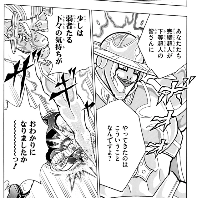 第458話でファナティックがネメシスに言うじゃないですか。「どうです 惨めでしょう。力が足りないというのは? あなたたち完璧超人が下等超人の皆さんにやってきたのはこういうことなんですよ? 少しは弱者たる下々の気持ちがおわかりになりましたか〜〜〜っ!」。で、ネメシスはそう言われて、ロビンマスクのことを思い出すという、ここがいいんだよなあ......。