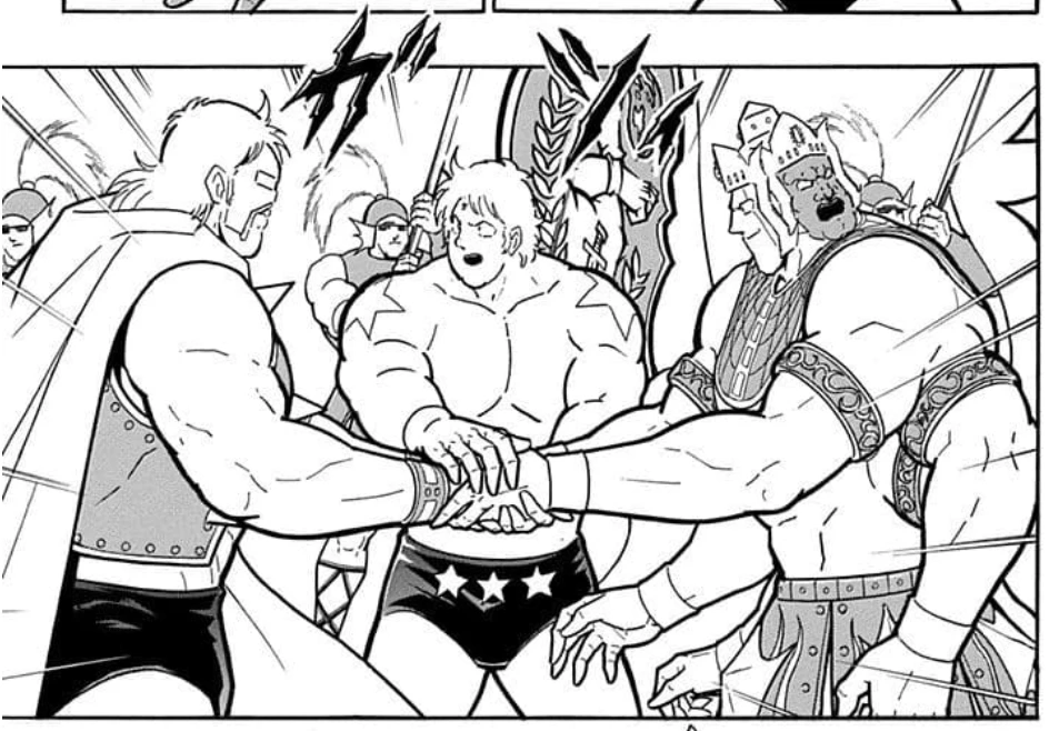 正義超人代表・テリーマンに加えて、悪魔超人代表・アシュラマン、完璧超人代表・ネプチューンマンが三属性不可侵条約に調印を行なった