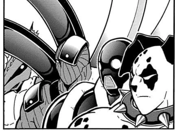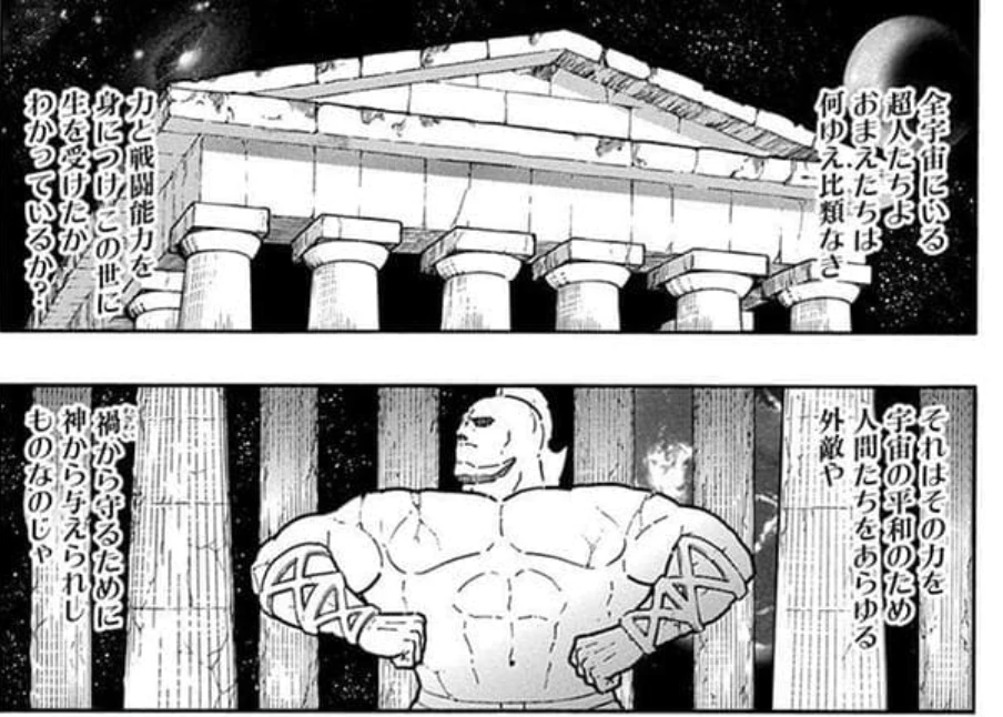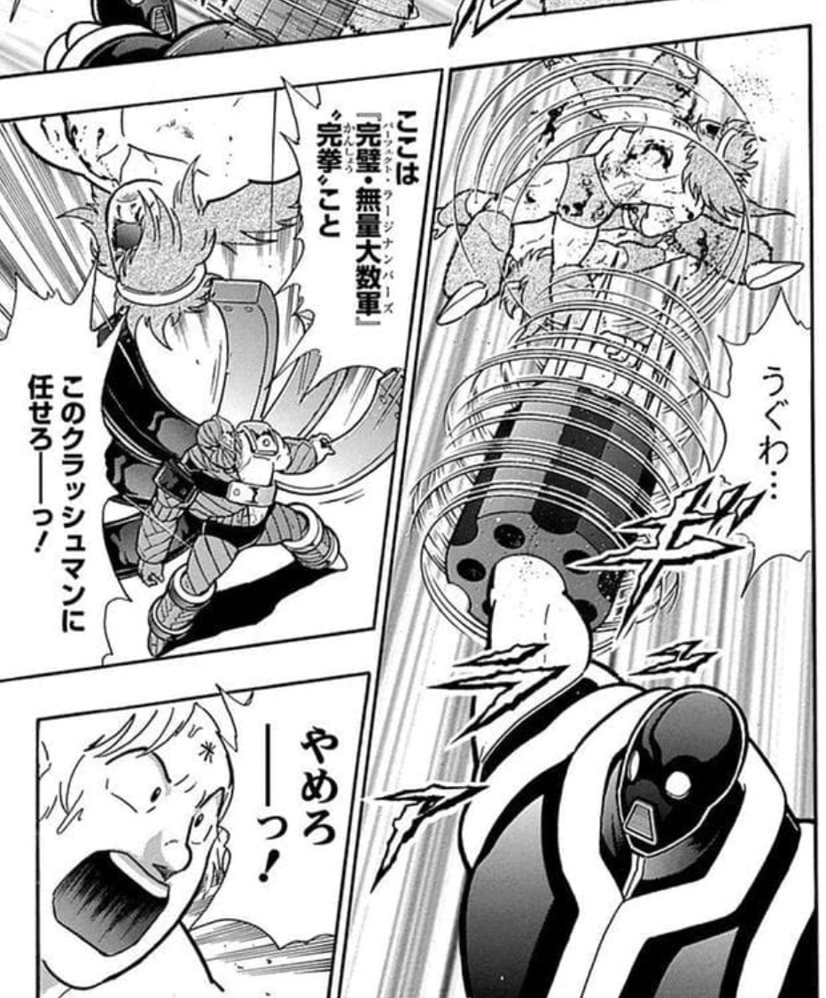 こうしてすっかり平和になった世の中の様子が描かれる新章第1話ですが、その最後のページになってようやく、敵らしき超人が空から降ってきます。それがあのビッグ・ザ・武道(ブド―)と似た容姿を持つストロング・ザ・武道ら新手の完璧超人軍団、その名も「完璧・無量大数軍(パーフェクト・ラージナンバーズ)」でした。
