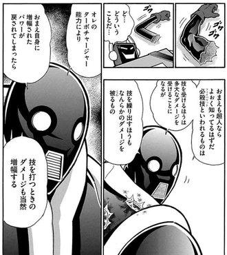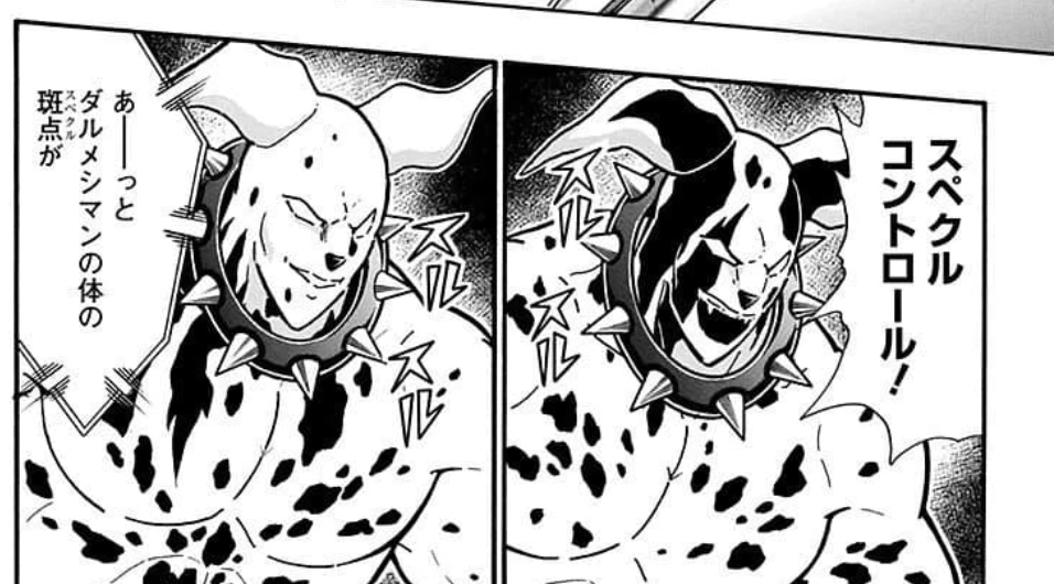 これぞまさに超人対決! 四次元空間を操るブラックホールの特異性は言わずもがな、それに難なく対応を見せる犬の超人ダルメシマンもただ者ではありません。特に度肝を抜かれたのは、全身の黒い斑点模様(スぺクル)を自在に動かし、攻防に使うという特技ですね。