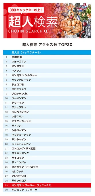 また、11月から59ランクもアップしたのが"戒律の神"ランペイジマン。原作に最後に登場したのは約2年前のことですが、スマホゲーム『キン肉マン 極・タッグ乱舞』に実装された効果でしょうか。あのロビンマスクを苦しめたランペイジマンの闘いぶりはコミックス80巻、81巻で描かれていますので、ゲームから知った方は要チェック!