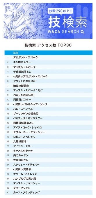 技検索のほうは「キン肉バスター」が4位から2位に、「アパッチのおたけび」が8位から6位に浮上するなどの変動はあるものの、あまり大きな変動はなく。