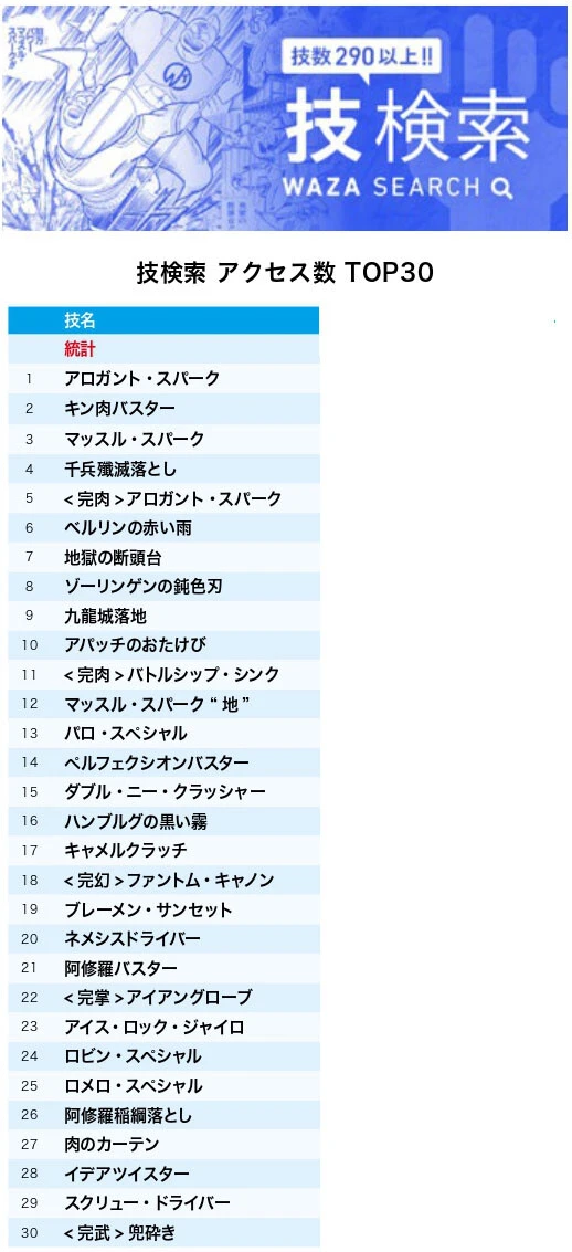 ちなみにラーメンマンの技も4つ中3つがベスト30にランクイン! 「九龍城落地(ガウロンセンドロップ)」が9位、「キャメルクラッチ」が17位、「ロメロ・スペシャル」が25位で、「飛翔龍尾脚(ひしょうりゅうびきゃく)」だけが圏外に...。みんな、「飛翔龍尾脚」のページも読もう!