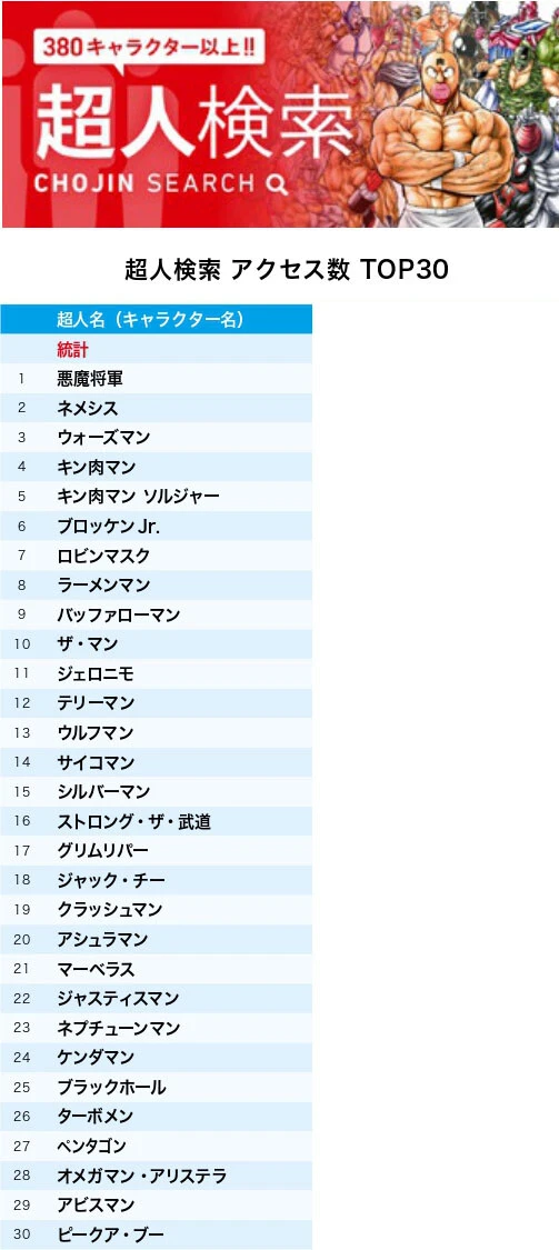 またTVアニメ『キン肉マン』完璧超人始祖編Season 2で活躍中のブロッケンJr.とラーメンマンがそれぞれ先月9位、10位から6位、8位にランクアップ! このふたり、技検索ランキングのほうもすごいことになっているので要注目です!