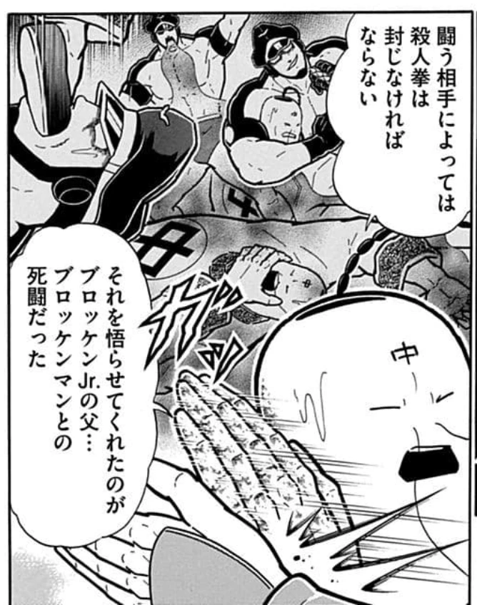 ブロッケンマンからラーメンマンが悟りをもらい、そのラーメンマンがブロッケンJr.を導いた。JC42巻メインの2試合がつながる見事な構成