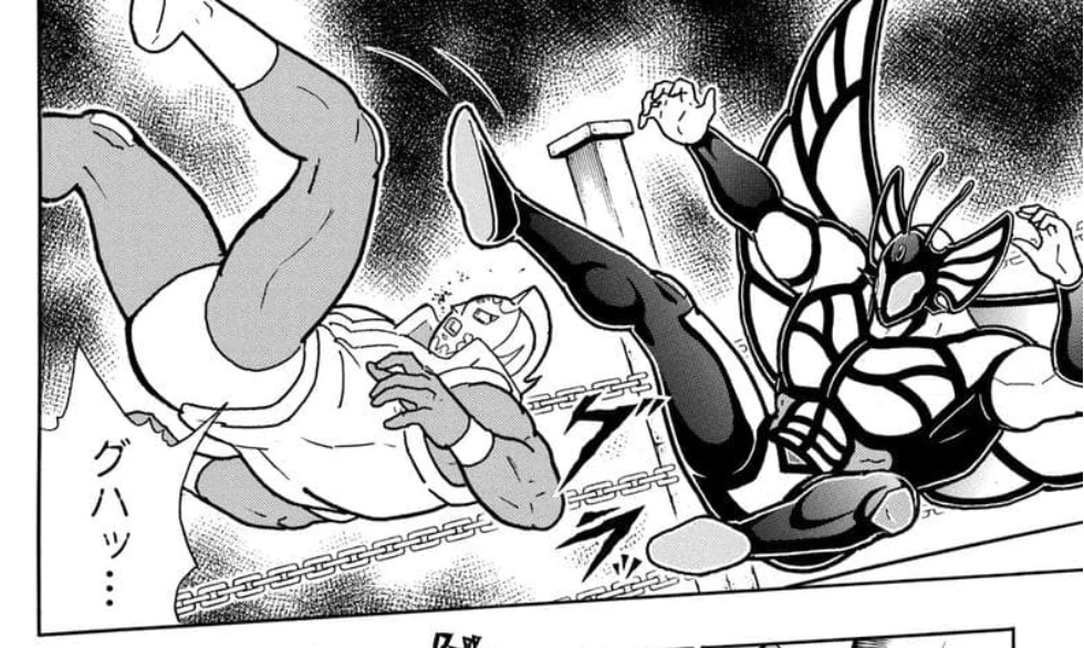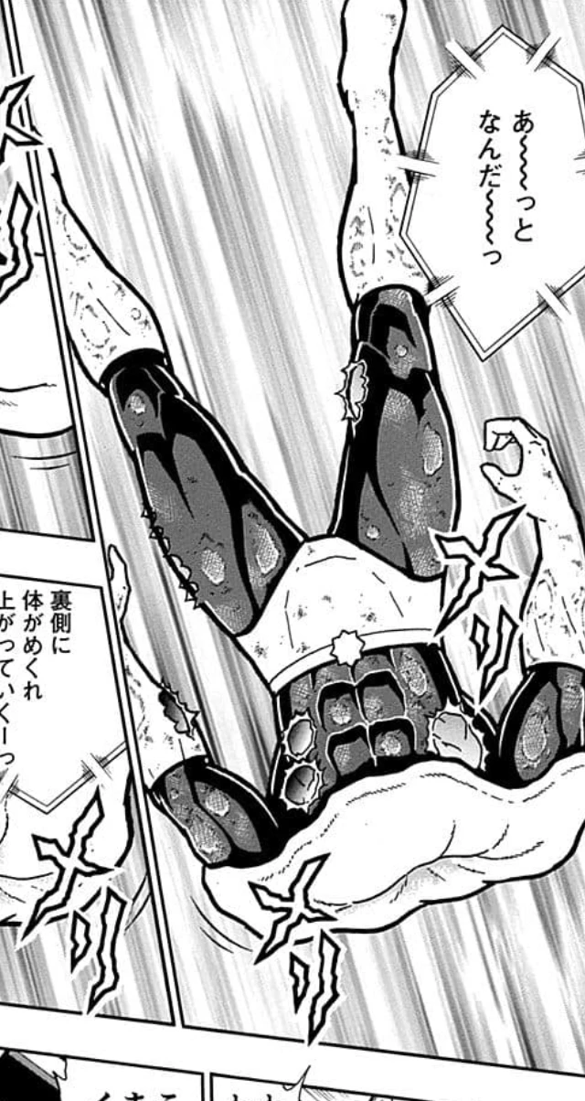 燃 あと第477話の最後のページ、ネプチューンマンがパピヨンマンにスリーパホールドしたままでジャーマン気味にスープレックスを極めるじゃない? この技って昔から......。