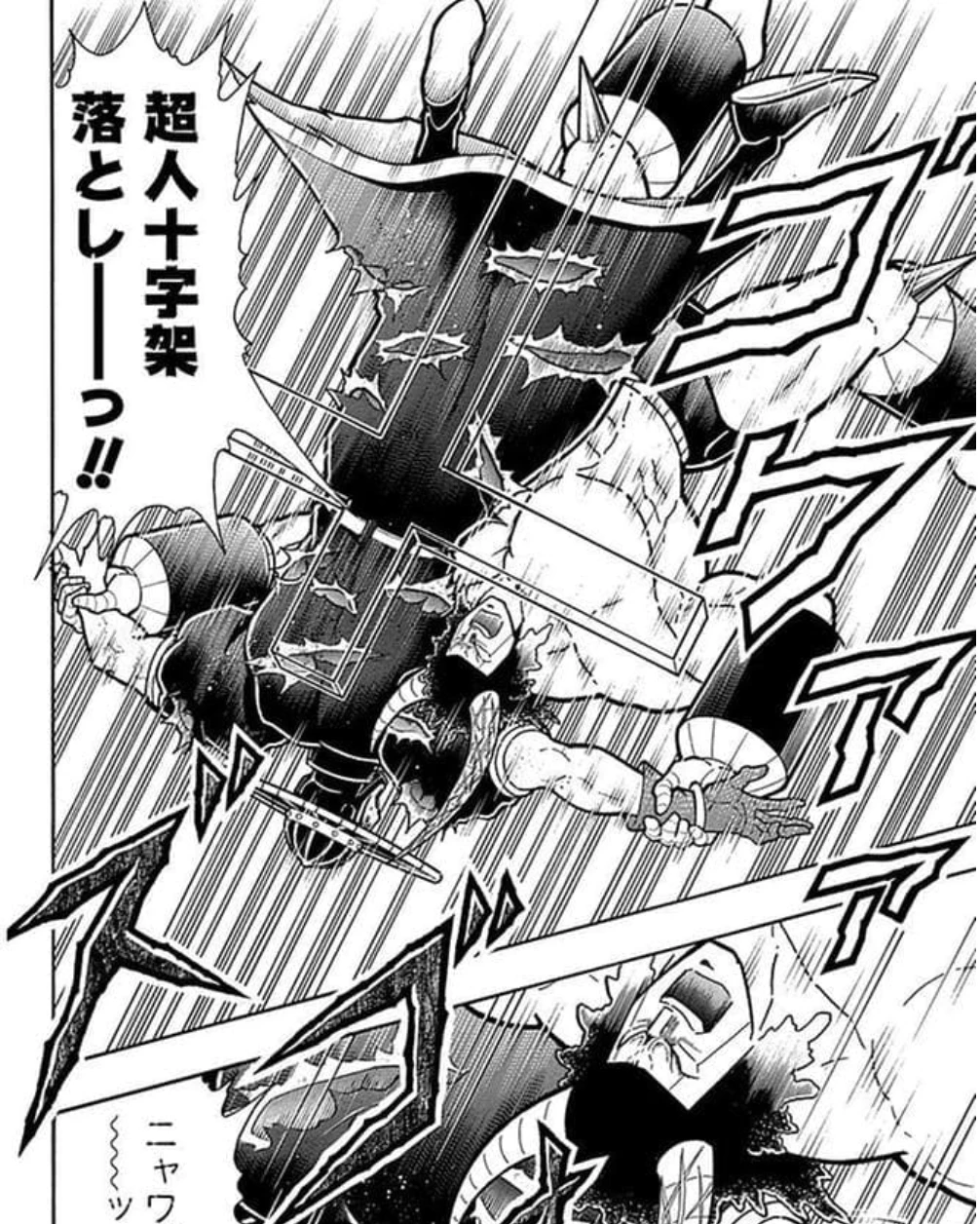 さて、バッファローマンとグリムリパーの一戦に話を戻しますが、怒りに燃えたバッファローマンは、かつての悪魔超人時代の面影を残した苛烈なファイトでグリムリパーを圧倒します。最後は、代名詞のハリケーン・ミキサーの連発からの超人十字架落としでフィニッシュ。死神の化身を十字架落としで倒すというこの締め方も、非常にオシャレですよね。
