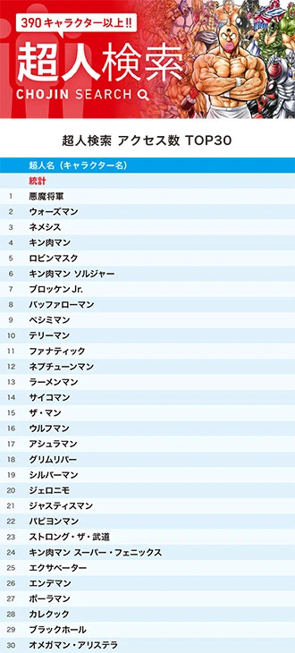 また、4月4日に発売されたコミックス88巻で登場したエクサベーター(25位)やエンデマン(26位)、同日発売の『読切傑作選2015-2023』での活躍も印象的だったウルフマン(16位)も前月からランクアップ。単行本派の読者の方も、ぜひこれからも超人検索・技検索をご利用ください!