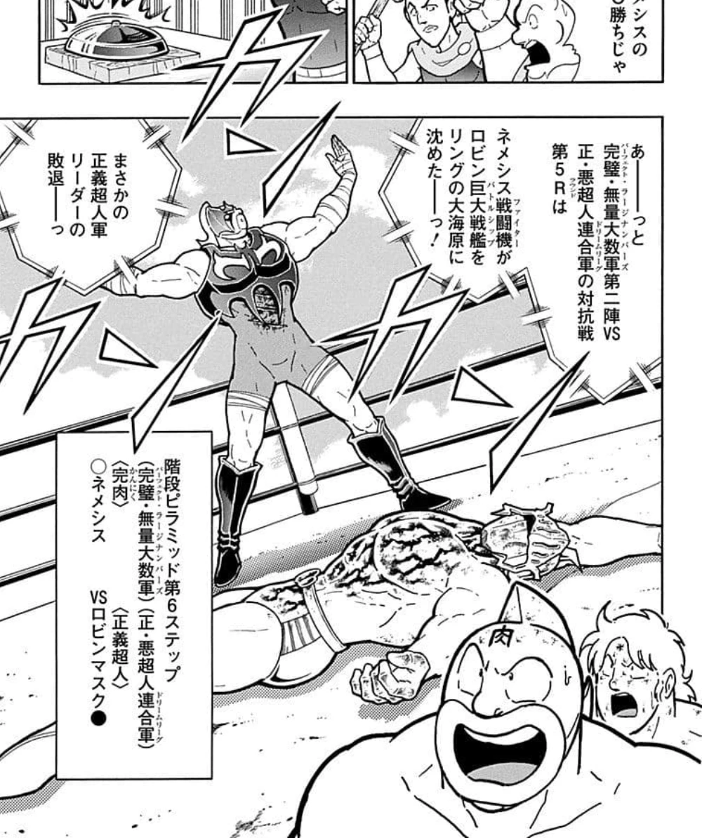 冒頭の第64話では、前回語ったロビンマスクVSネメシス戦のクライマックスが描かれます。ネメシスの<完肉>バトルシップ・シンクを浴び、ロビンマスクの心音が徐々に弱まり、やがて止まってしまいます。