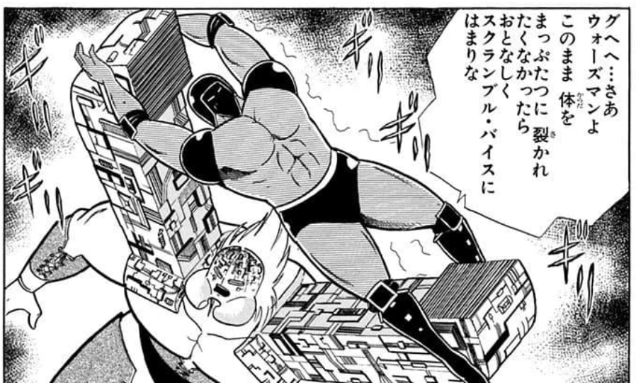 ウォーズマンはその実力とは裏腹に、負け姿の印象が強い超人ですが、それに拍車をかけているのが試合中の尋常じゃないダメージ描写でしょう。ベコベコに凹むヘルメット、一本を残してブチ折れるベア・クロー、全身からは火花が散ったり、煙を吹いたりと徹底的に痛めつけられます。