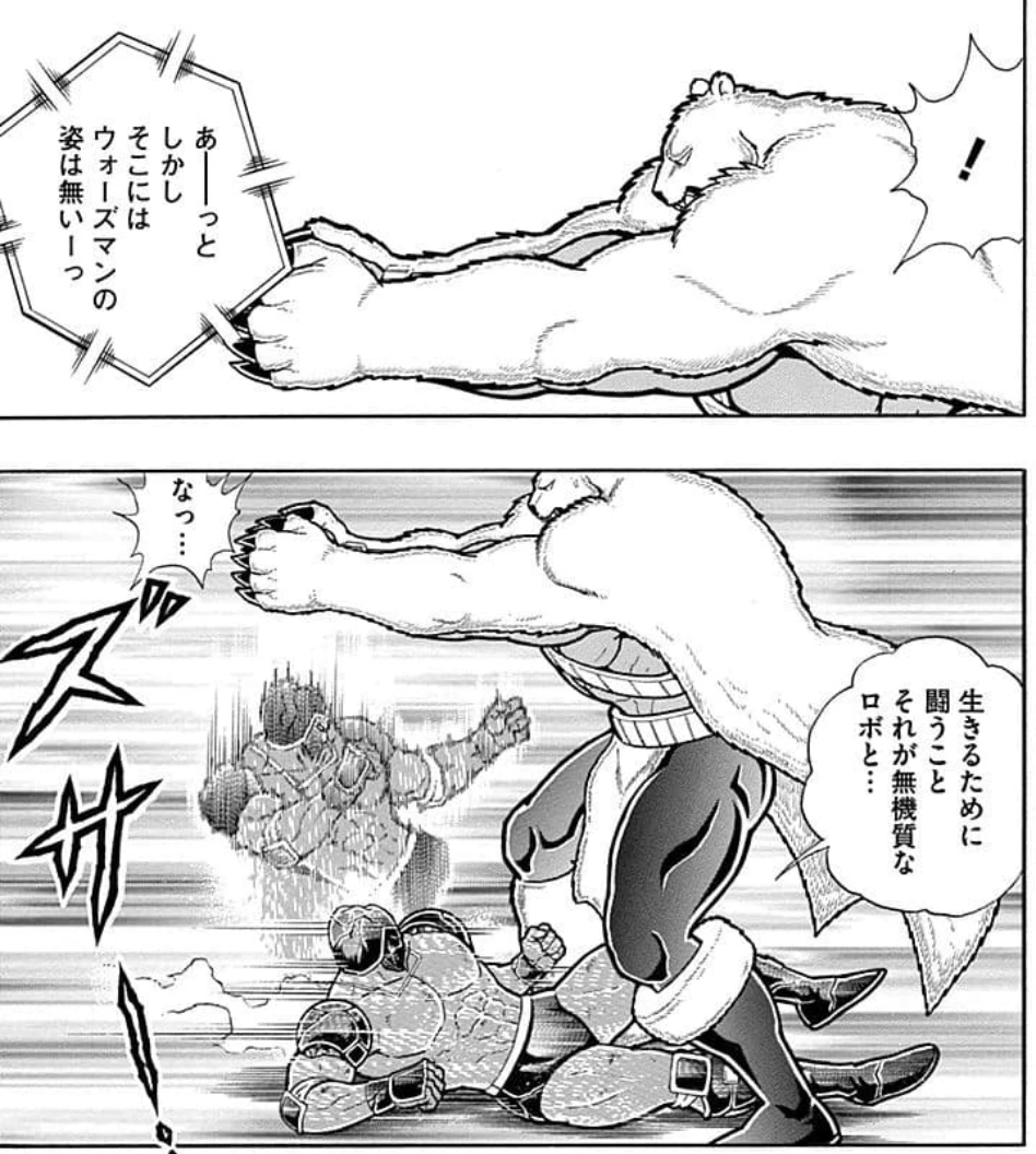 今回のポーラマンもそういう不遇な目を想像してしまうような相手だったのですが、師であるロビンマスクの弔(とむら)い合戦ということもあって、ウォーズマンも鬼気迫る勢いで立ち向かいます。さっそく序盤からロビンから学んだテクニックを駆使して攻め立てるのですが、ポーラマンはその猛攻をものともしません。