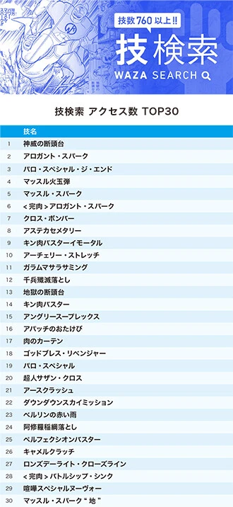 「マッスル火玉弾」以外にも「アパッチのおたけび」(圏外→16位)、「肉のカーテン」(圏外→17位)、「超人サザン・クロス」(圏外→20位)、「ベルリンの赤い雨」(圏外→23位)、「キャメルクラッチ」(圏外→26位)と、圏外からのランクインが多数あり、今月の技検索はかなりの大混戦となりました。いや~、「アパッチのおたけび」も「肉のカーテン」も「封じ技」という分類なんですね。調べてみると面白い発見がたくさんあります。