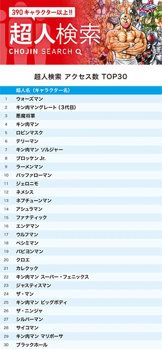 超人検索ランキングでは、統計開始以来、初めてウォーズマンが首位に登場! これまで2~3位にいることが多かったウォーズマンですが、ようやく悲願達成です。
