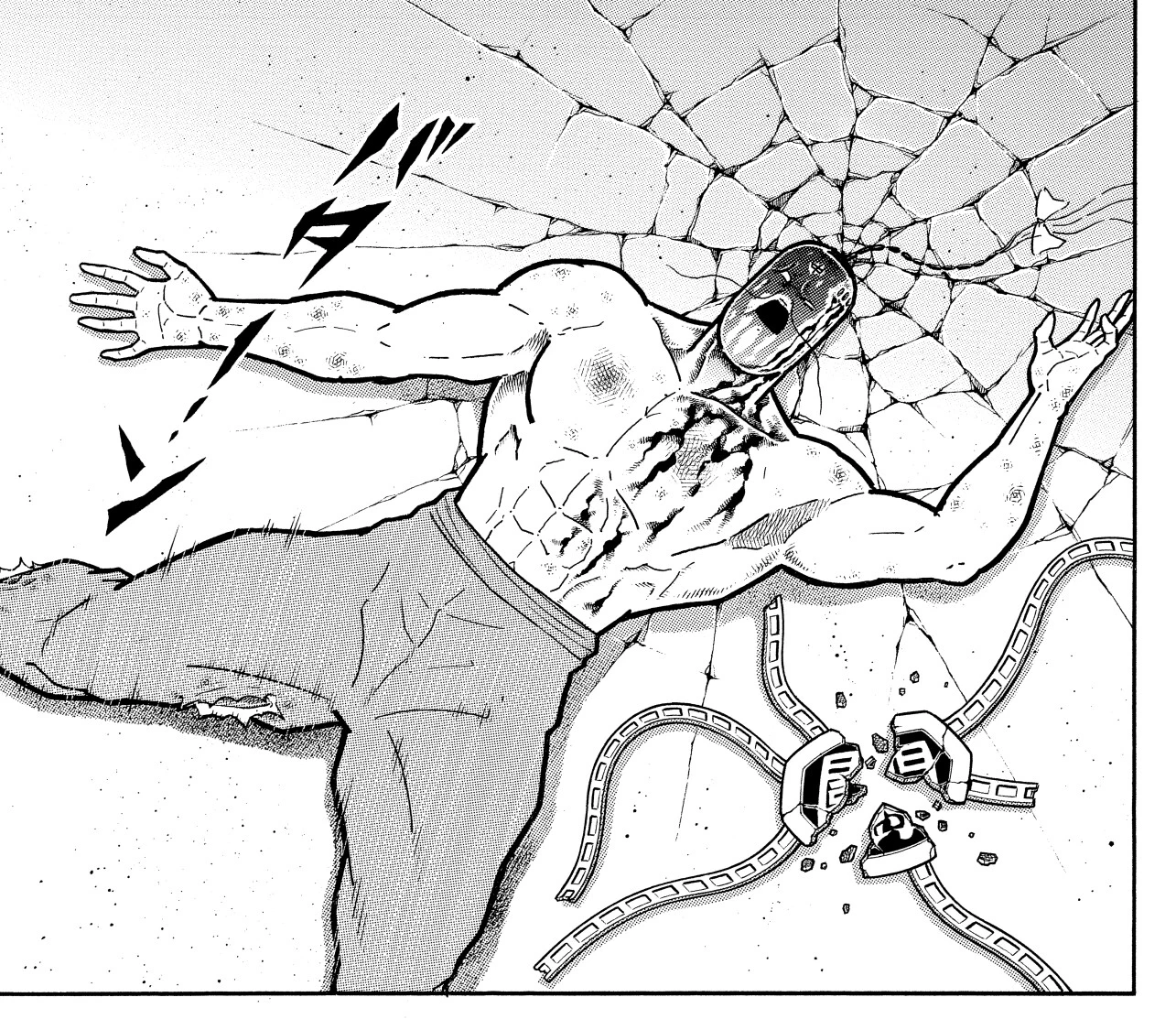 横たわるラーメンマンの傍らには、粉々に砕かれた「闘」の肩当てが...