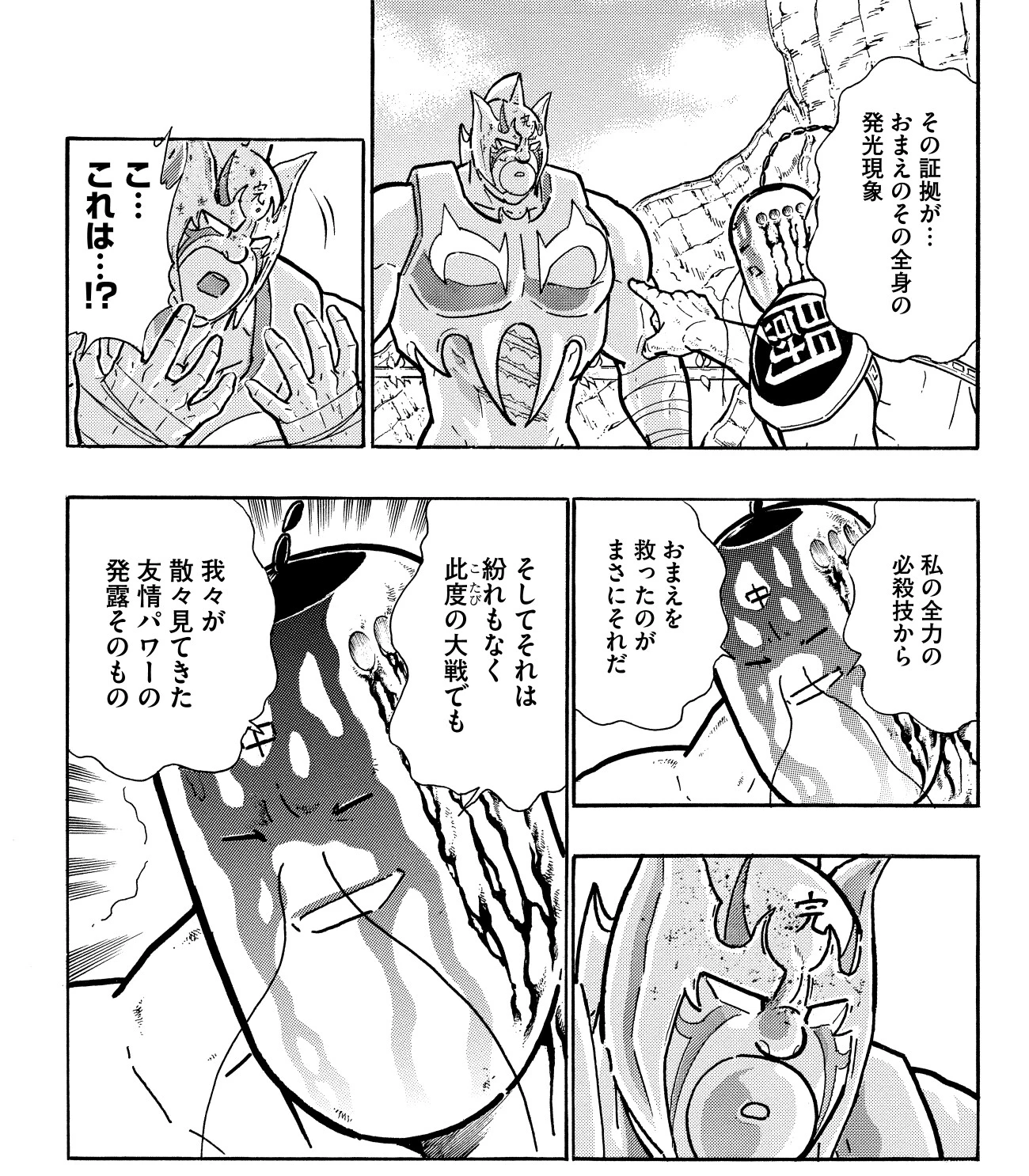 KO必至と思われたラーメンマンの「九龍城落地」に、なぜネメシスは耐えることができたのか......? それはロビンマスクとの一戦を経て、正義超人が最大の武器としている友情パワー、またの名を〝火事場のクソ力〟が、知らず知らずのうちにネメシスの心に灯(とも)っていたからでした。