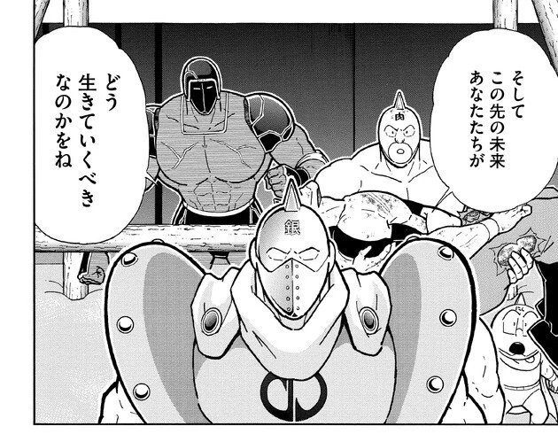 それからサイコマンに試合の裁定を任されたシルバーマンは、倒れ伏したブロッケンJr.に制裁を加えることもなく、彼を丁寧に抱きかかえて場外にいるキン肉マンのもとへと運びました。キン肉マンは、自身の祖先でもあるシルバーマンに感謝を述べつつ、前巻でサイコマンの口から語られた「シルバーマンは完璧超人のスパイ」という情報が事実かどうかを尋ねます。シルバーマンは優しい笑みを浮かべると、それは超人墓場を離れるための方便であると否定しました。そして、正義超人の祖であるシルバーマンの口から直接、"正義超人"という枠組みが生まれた真相が語られます。