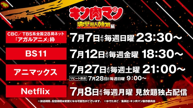 また、BS11では7月12日より毎週金曜18時30分〜放送、アニマックスでは7月27日より毎週土曜21時〜放送される。さらに配信は、Netflixにて見放題独占配信が決定した。7月8日より毎週月曜日に最新話が更新される。