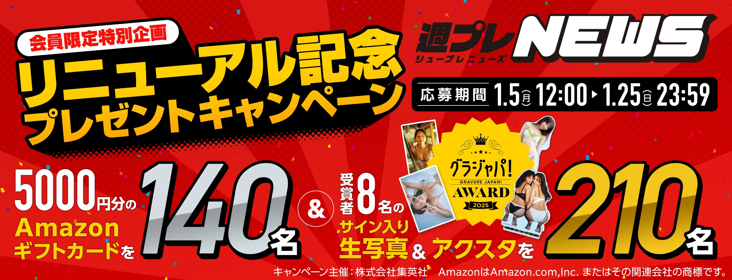 週プレNEWS会員・メールマガジンを無料登録して簡単なアンケートに答えて応募すると、Amazonギフトカード総額70万円分と、「週プレ グラジャパ!」が主催する年に一度の祭典「グラジャパ!AWARD 2025」の受賞者8名のサイン入り生写真&オリジナルアクリルスタンド(アクスタ)を、抽選で計350名様にプレゼント!