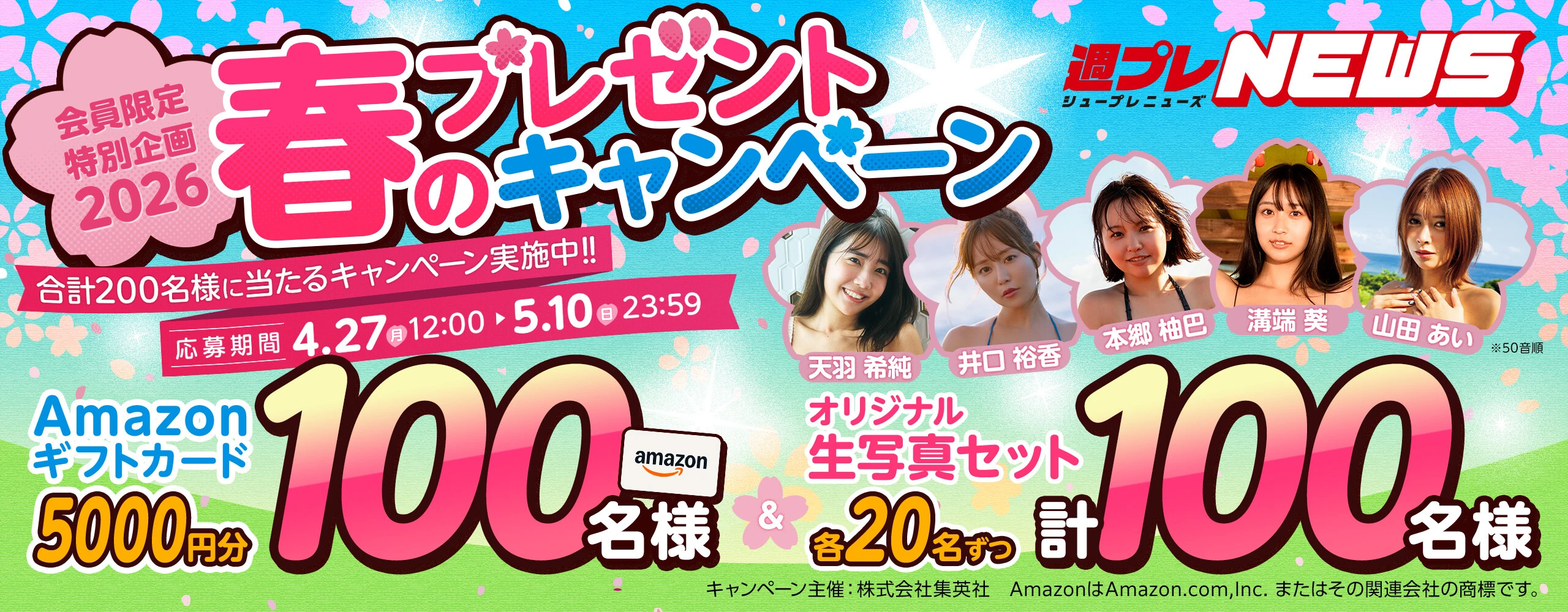 この春に『週刊プレイボーイ』本誌の表紙・グラビアや、週プレのECサイト「週プレ グラジャパ!」で配信中のサブスク「週プレ プラス!」に登場してくれる5人のタレントさんより、ここでしか手に入らないオリジナル生写真セット(天羽さん、井口さん、山田さんはB2ポスターも!)を各20名ずつ計100名にプレゼント。いまをときめく女の子たちからの、ここでしか手に入らない貴重なプレゼントをゲットしてください!