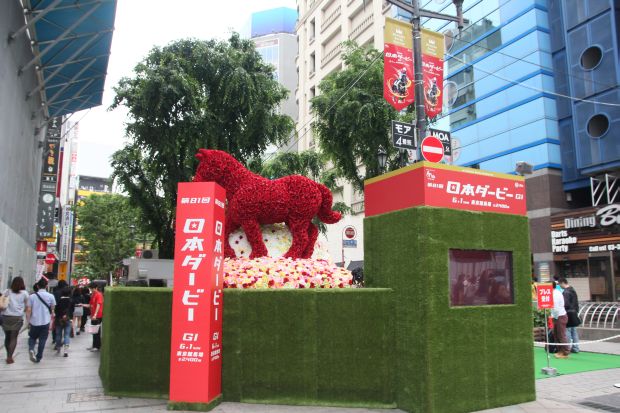 新宿駅周辺が日本ダービー一色に染まるこのイベント。メイン会場は、新宿駅東口を出てスグ、アルタの先を左に曲がったオシャレな一角、モア4番街で、この通りがさまざまなモニュメントが立ち並ぶ「ダービーストリート」になっている。