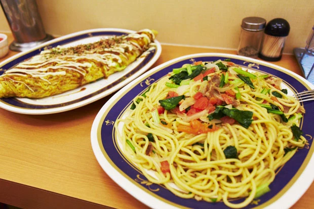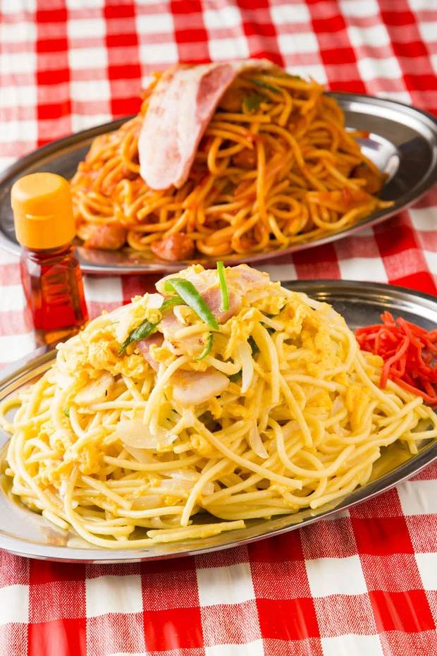 ●冷やしナポリタン 600円中華麺のツルッとした食感は、ナポリタンの概念を変えるおいしさ。初夏から秋口までの季節限定メニューだ ●焼きそば風スパゲティ 650円ソースの香りがたまらない! 豚肉とキャベツを炒めた新食感の焼きそば風パスタ。子供の頃のお祭りを思い出す、懐かしい一品だ