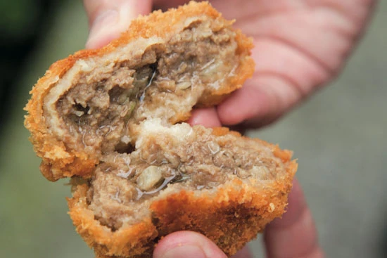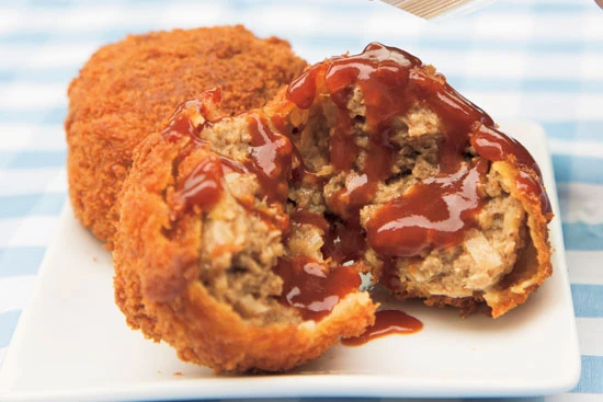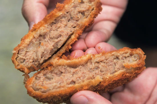 見た目は小判形の王道メンチカツ。ひと口かみ締めると「ギュッ」と詰まった肉の食感が楽しめる、昔ながらのほっとする味