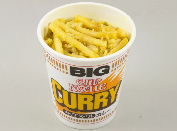 カレーとジャガイモが合わないわけがない! じゃがりこを半分先に入れて、後から残りを入れると、しっとりサクサクふたつの食感が楽しめる。炭水化物まみれなので、確実に満腹になります!