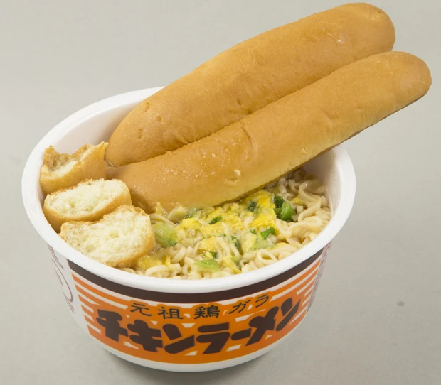 ■チキパンラーメン 計272円 ほんのり甘いスティックパンの風味とチキンのやさしい醤油味のスープが大融合。イメージは「お麩のみそ汁」の洋風アレンジ。スープを吸って膨張したパンでボリュームたっぷり。スープは濃いめに作るのがポイントです