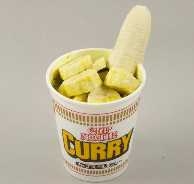 ■バナナカレーヌードル 計270円 バナナの甘さとカレーのスパイスがマッチ。1本は多いので半分を輪切りにして入れると、スープとしっかり絡んで満足感がアップする