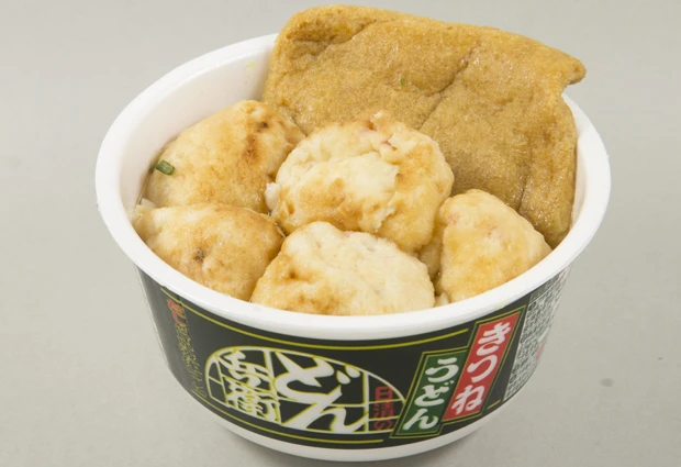 ■きつね明石うどん 計334円 冷凍のたこ焼きを、カップうどんへ追加。スープに浸りふわふわになった、たこ焼きは絶品。熱々を食べるためには、先にたこ焼きを半分に割ってから入れて、お湯を注ぐのがコツ。これ、ほぼ明石焼きです!