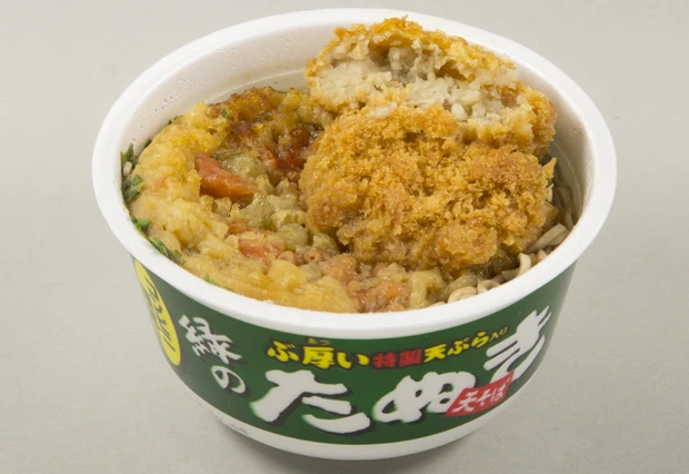 ■天コロそば 計242円 カップそばに、コロッケを追加し、立ち食いそばの定番メニューを再現。味は言わずもがな抜群! 後のせで衣のサクサク感を味わうのも格別だが、先に入れてジャガイモのホロホロ感を楽しむのもよし
