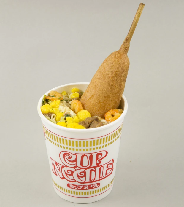 カップヌードルにコンビニのアメリカンドックを投入。ソーセージの肉のダシがスープに染み出て、味わい深くなる。周りの生地もスープを吸って、甘辛具合が絶妙オニオングラタン風味にメガ進化!!