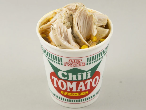 ■肉激盛りイタリアンヌードル 計385円 コンビニのサラダチキン(ハーブ味)をチリトマトへ追加。鶏肉の量が多く、確実に満腹になる。味つけのハーブとトマトスープとの相性がぴったり。しっかりスープに浸して食べるべし!