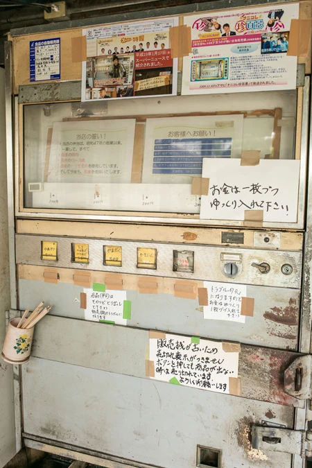 年季が入ったボロボロの自販機だが......実はコレ、多いときで一日に100食を売り上げる大人気のお弁当の自販機なのだ!! 自販機が設置された昭和47年から変わらぬメニューは、焼き肉、ヒレカツ、唐揚げ弁当の3種。「あらいやオートコーナー」を営む鈴木さんの奥さんが365日休むことなく作り続けている!