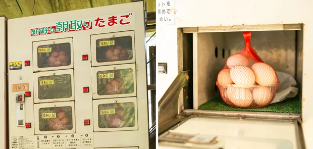 岡田さんご夫婦が経営している養鶏場の新鮮な卵が買える自販機。20年前から地元の人々に愛され続け、多い日は一日に500(!)個近くもの卵が売れるという。お金を入れてボタンを押すと、パカンとフタが開いて、つややかな卵がお目見え。そんな"レトロな作り" も実に味がある! 【岡田養鶏場 埼玉県吉川市大字南広島2148―1】