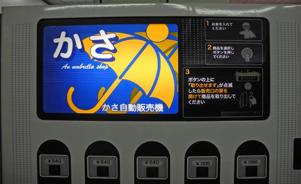 関東の数ヵ所の駅にしか置かれていない、実はけっこうレアな傘の自販機。どういう基準で設置されているのかは定かでないが、急な雨でキヨスクが激混み!なんてときも意外と便利かも......? 品ぞろえは、ビニール傘(540円)、ジャンプ傘(1030円)、折り畳み傘(1080円)の3 品! 【KIOSK 水道橋駅内】