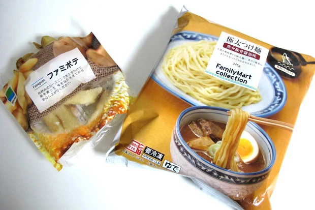 ファミリーマートの冷凍「極太つけ麺」は177円(税込み)。セブン-イレブンは冷蔵・冷凍の2種類あるが、冷蔵「魚介豚骨醤油スープのつけ麺」は150gの麺が2食入って203円(税込み)。