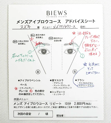 最後に自分でケアするときのポイントをまとめたアドバイスシートがもらえる。再びケアしてもらうなら3週間~1ヵ月後に。何もしないとだいたい2ヵ月で元に戻るとか。