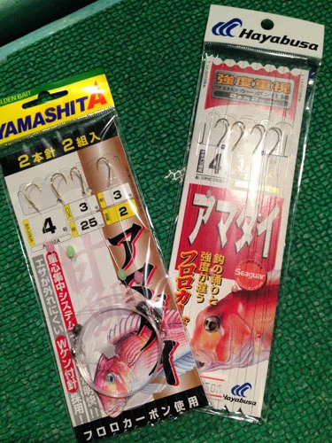 【今回使用しアマダイの仕掛】●中型片テンビンのふかせ仕掛仕掛:2本ハリ、全長は2.5m~3.0m(先端から80cmに枝ハリ20~30cmを出す)ハリス:フロロカーボン4号、最先端のハリの上20cmのところにガン玉オモリハリ:チヌバリ4~6号前後、オキアミ専用ケン付きハリ4~5号などオモリ:80号(PE道糸が2号以下ならオモリは60号でOKの場合も)アマダイのエサ:オキアミ